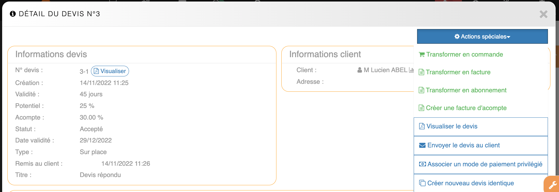 Actions spéciales du devis acceptéD'autres actions permettre de visualiser le devis, de l'envoyer au client par mail, d'y associer un mode de paiement privilégié et de dupliquer le devis.