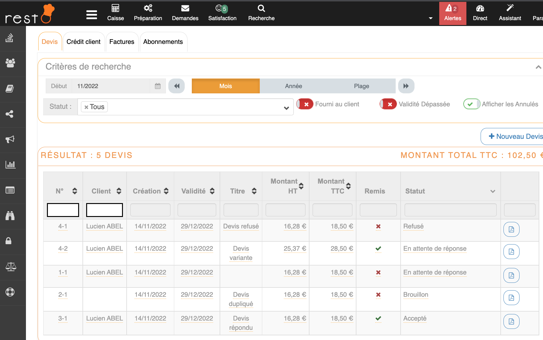 Un devis est un document qui permet de faire une proposition commerciale à une personne ou à une société. Avec la solution Restô, le restaurateur peut créer des devis complets avec toutes les informations nécessaires. Interface Liste des devis Le ...