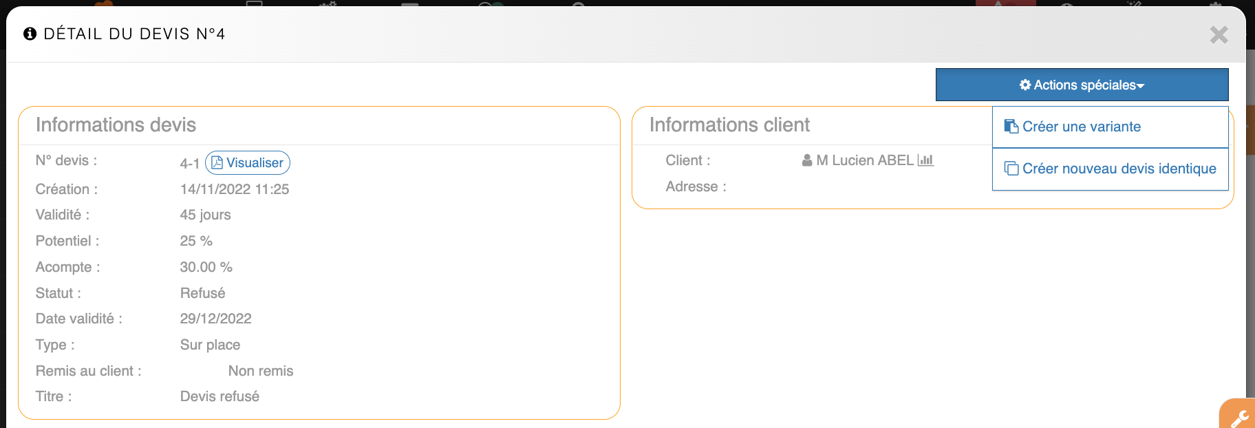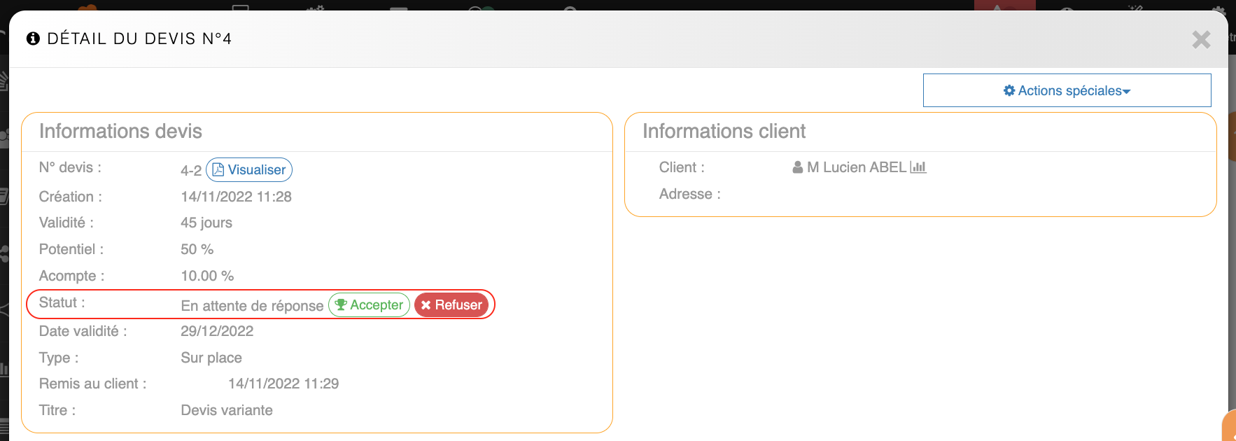 Actions spéciales du devis refuséSi le devis est accepté, de nombreuses actions sont possibles :