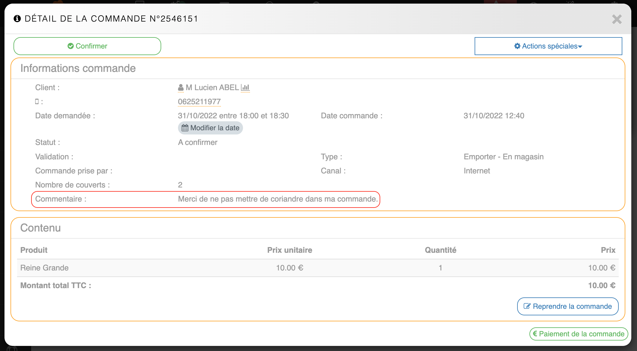 Depuis Restô, il est possible de laisser un commentaire sur une commande :