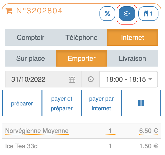 Panier Bouton commentaire commandePour ce faire, il suffit de cliquer sur la bulle à côté du numéro de la commande.