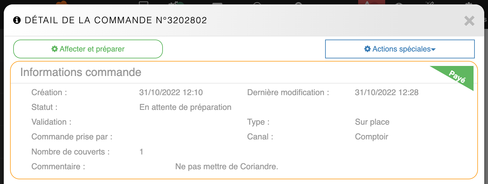 Depuis l'interface Caisse, il est possible d'ajouter un commentaire à une commande.