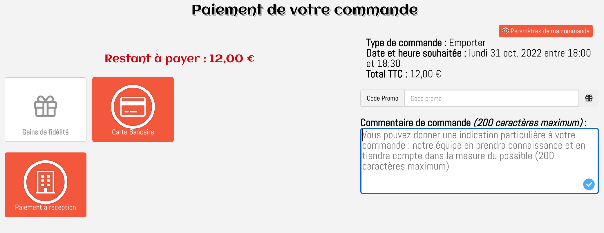 Fiche commande Commentaire clientCe message sera visible par le restaurateur depuis la fiche commande.