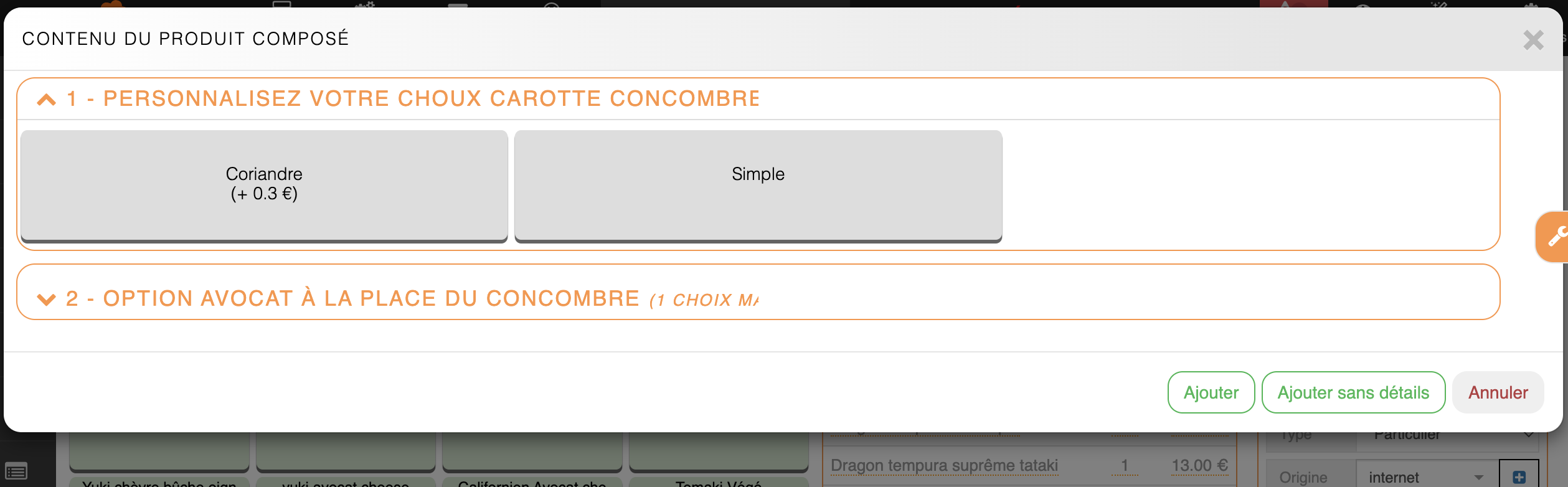 En caisse, pour ajouter un produit composé au panier, il faut cliquer dessus. Une fenêtre s'ouvre permettant de choisir les ingrédients à ajouter au produit.