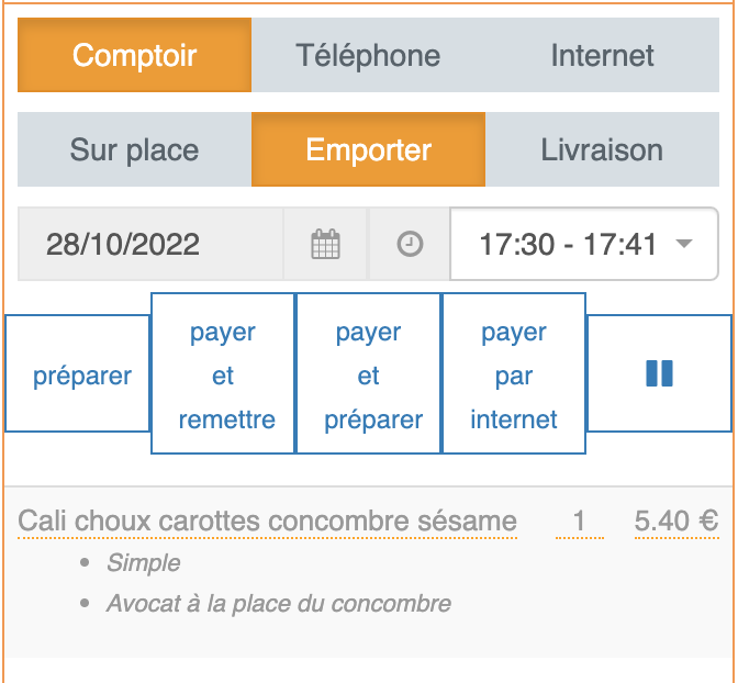 La solution Restô permet de prendre des commandes en caisse très facilement depuis l'interface Caisse. Interface Caisse Après avoir pris une commande, il est possible d'ajouter, de modifier et de supprimer des produits du panier (voir Ajouter un ...