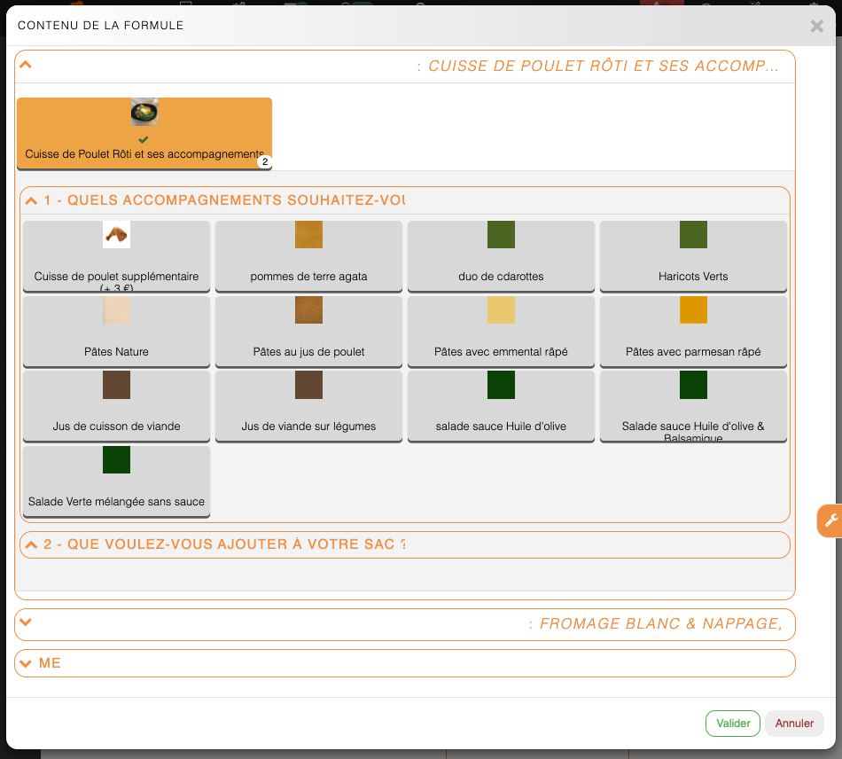 Interface Contenu de la formuleUne interface va apparaitre afin de sélectionner les divers choix qui composent la formule. Si la formule a été créée avec une composition par défaut, elle sera automatiquement ajoutée au panier.