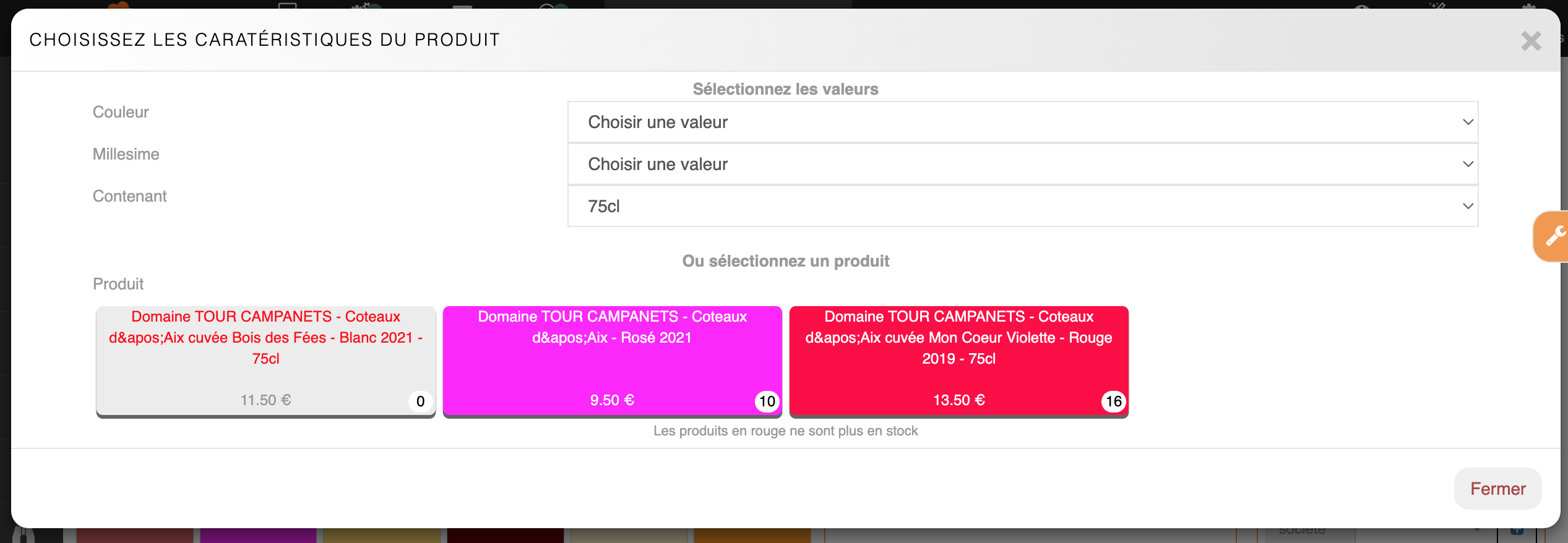 Pour ajouter au panier un produit modèle/variante, il faut cliquer dessus pour ouvrir l'interface de sélection de la variante.