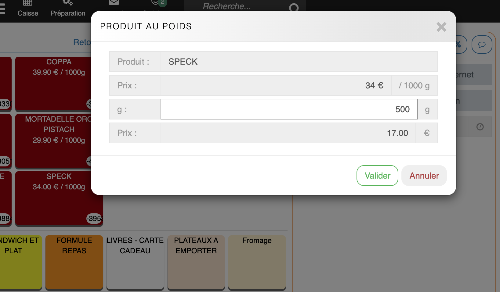 Restô permet aussi de créer des produits au poids. Il s'agit d'un produit vendu à un prix défini selon le poids indiqué lors de l'ajout au panier.