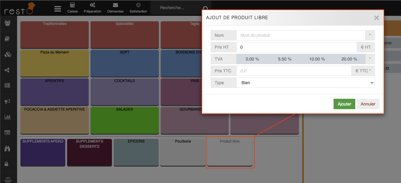 Restô permet également de pouvoir créer des produits libres, c’est-à-dire des produits qui sont créés que lors de la prise de commande en caisse, mais qui ne sont pas sauvegardés dans le catalogue. Le produit libre permet la saisie du nom, du prix et de la TVA lors de l'ajout au panier.