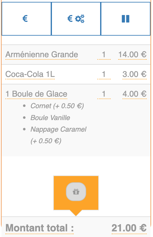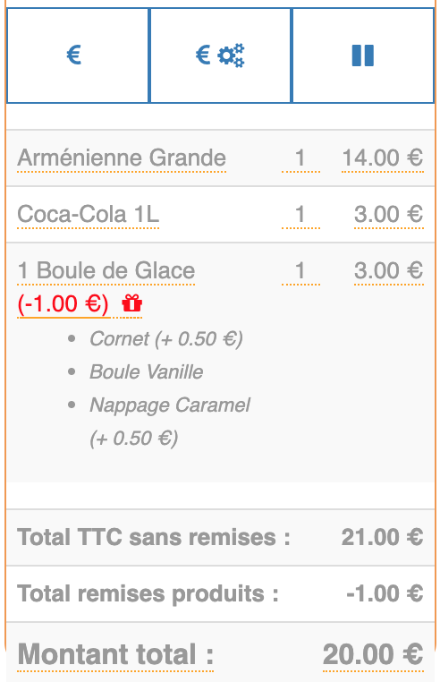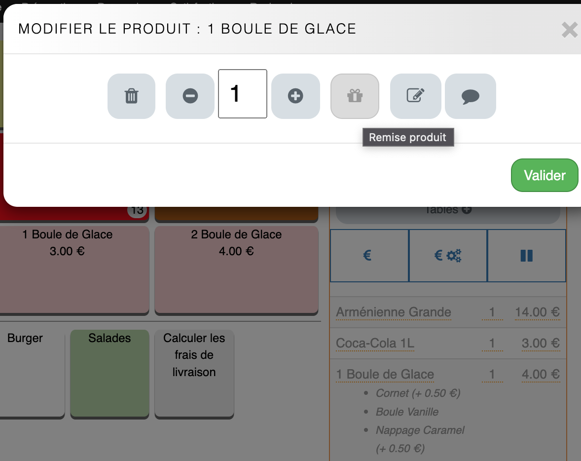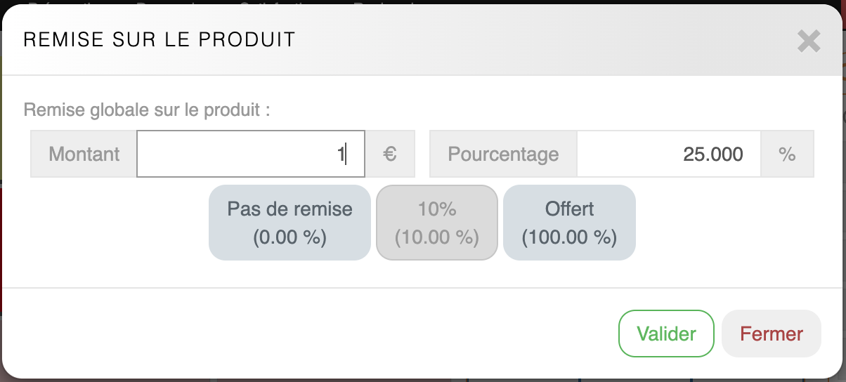 Modification produit Remise produitLe bouton Remise produit permet d'appliquer une réduction ou d'offrir un produit. Il est possible d'indiquer le montant ou le pourcentage de la remise.