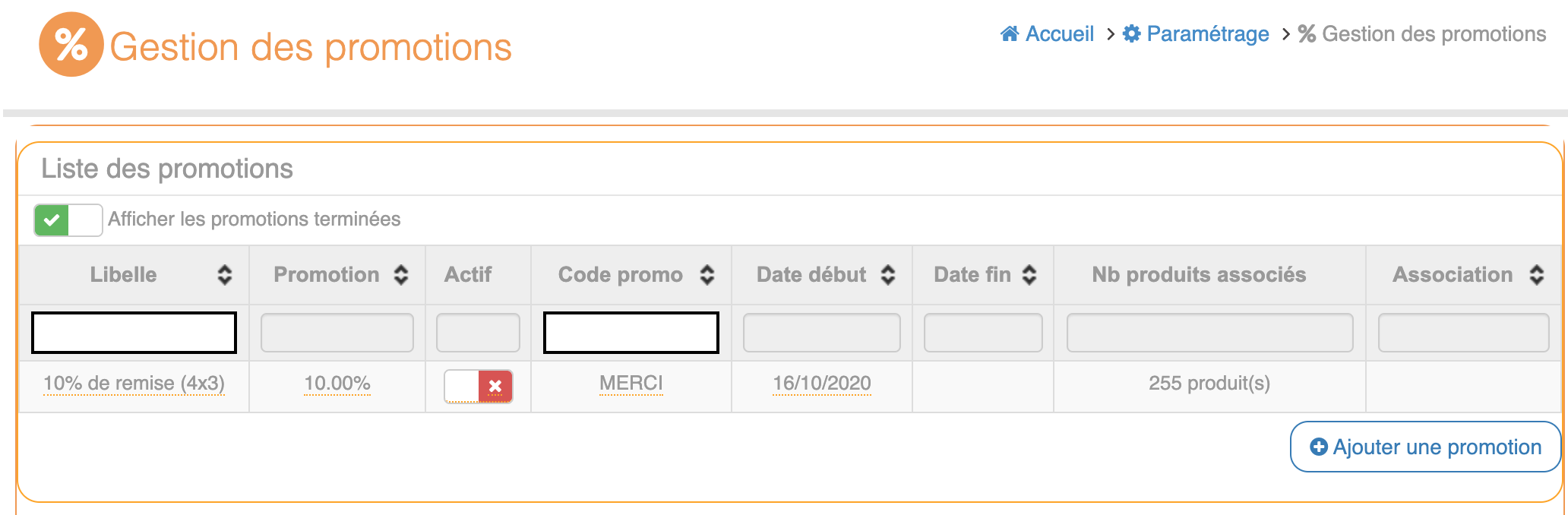 Voici l’interface de gestion des promotions où sont répertoriées toutes les promotions qui ont été crées. Pour voir toutes les promotions, il faut afficher également les promotions terminées