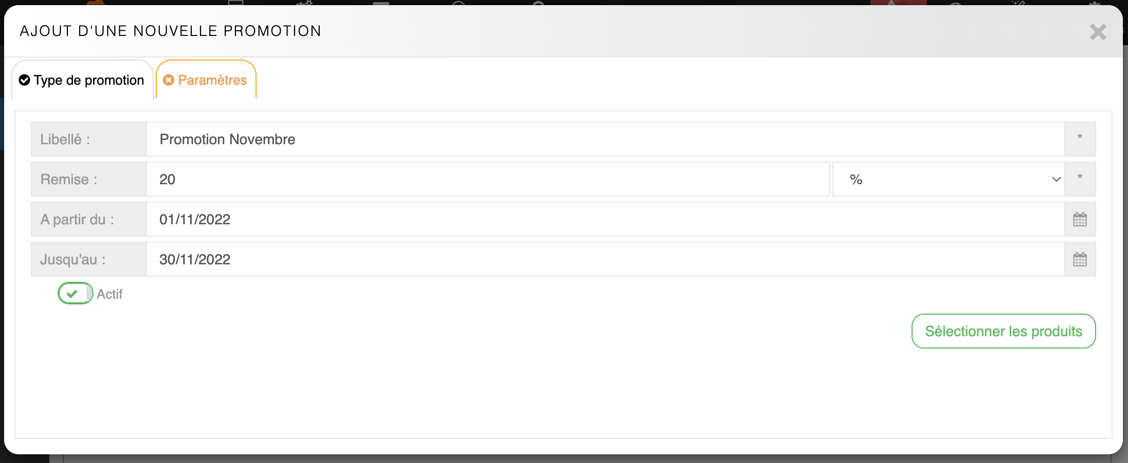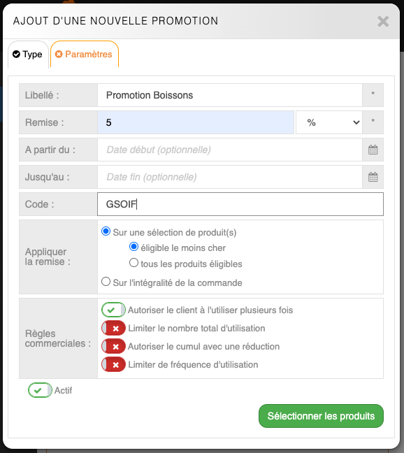 Il faut penser à rendre Actif la promotion avant de Sélectionner les produits éligible à la promotion.