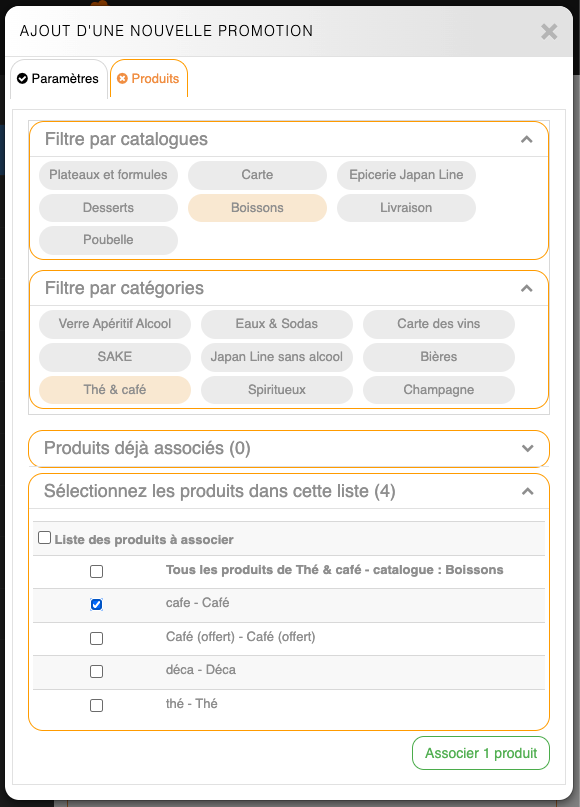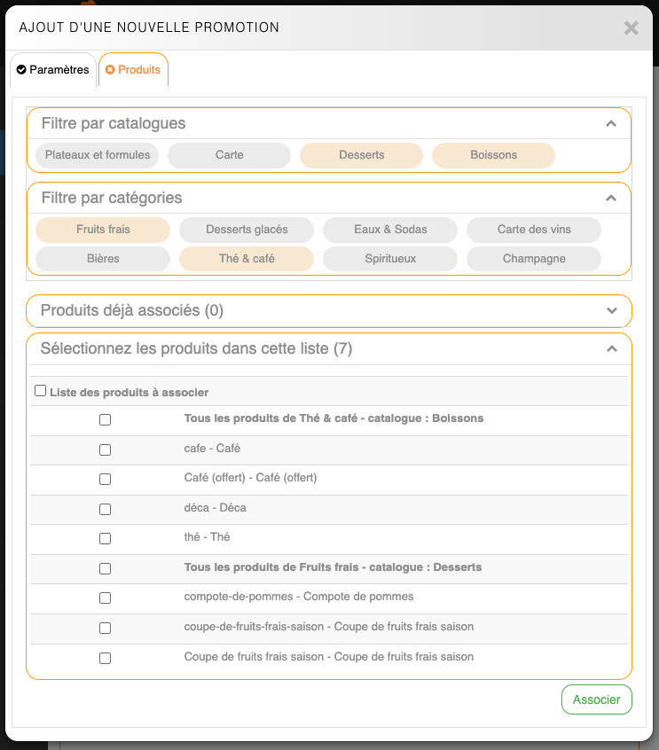 Réduction Association des produitsL'onglet Produit permet de filtrer par catalogue et par catégorie les produits à associer à la promotion. Une fois l'association terminée, il ne reste plus qu'à cliquer sur Associer.