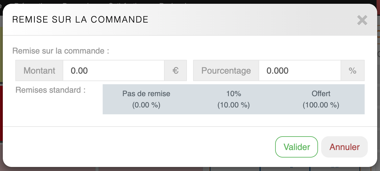 Interface Remise commandeCette interface permet d'indiquer le montant ou le pourcentage de la remise.