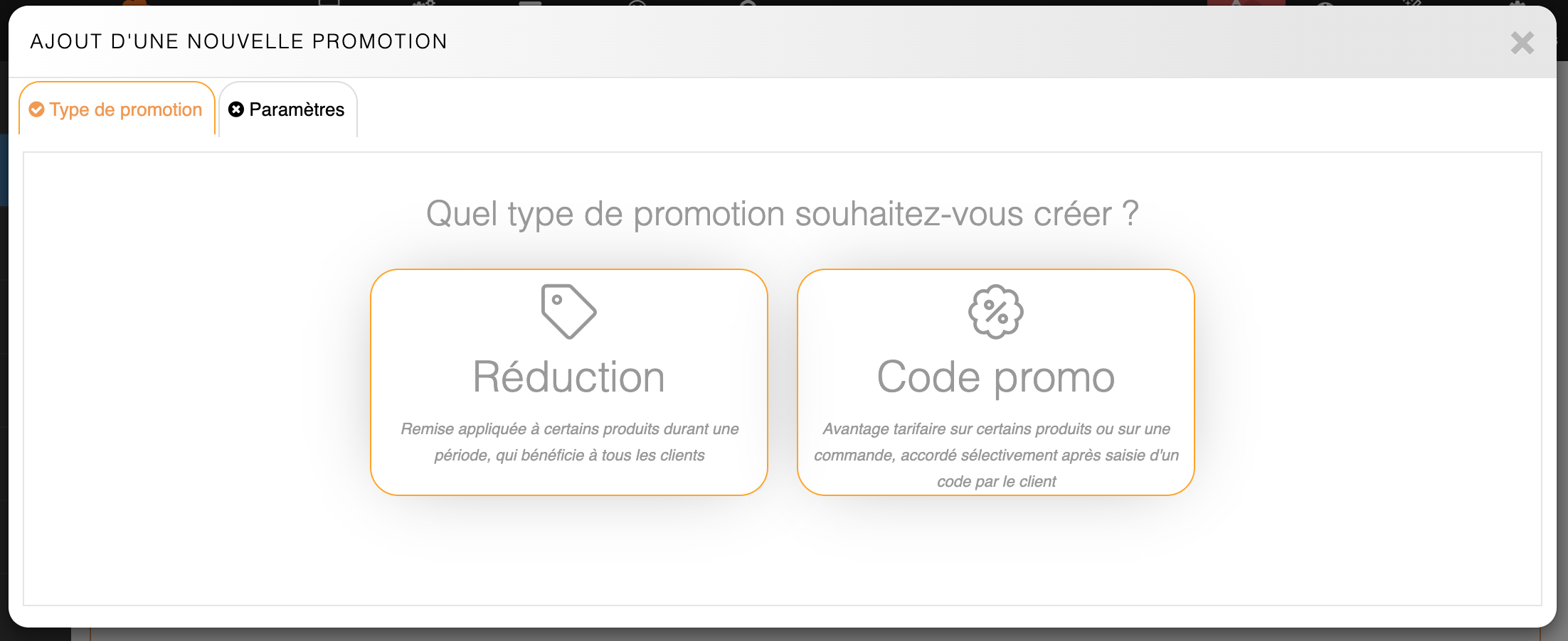 Une interface s'ouvre permettant de choisir entre 2 types de promotions :
