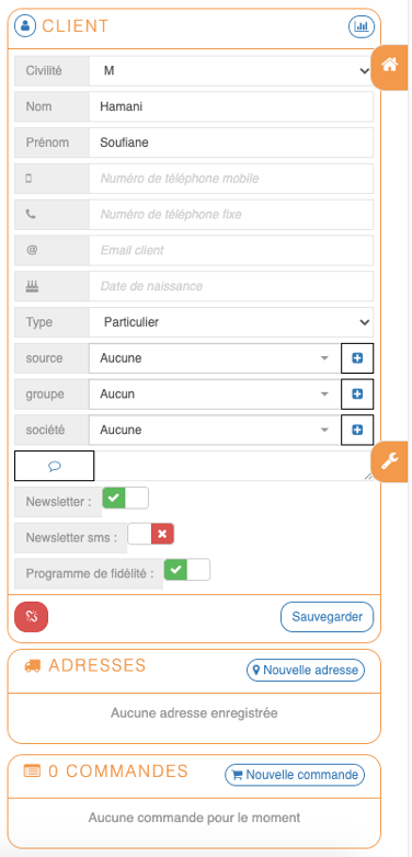Bloc Recherche clientAprès avoir sélectionné le client, il sera directement associé à la commande.