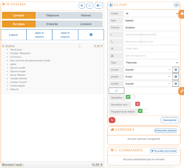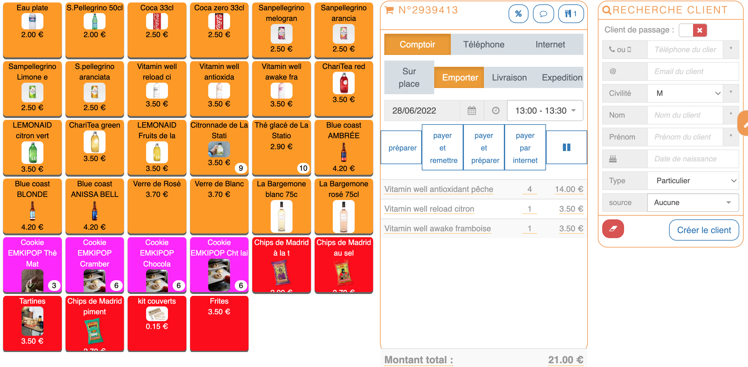 Prise de commande en caissePour associer une commande à un client, il suffit d'ajouter les produits souhaités au panier.