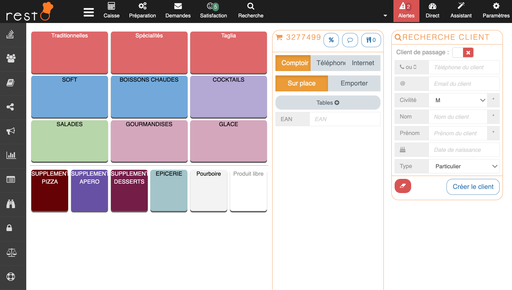 Lors de la Prise de commande, après avoir Associer une table à la commande, il est également possible d'associer un client à la commande. Pour ce faire, il suffit d'aller en caisse et d'utiliser le bloc « Recherche client » sur la droite afin de ...