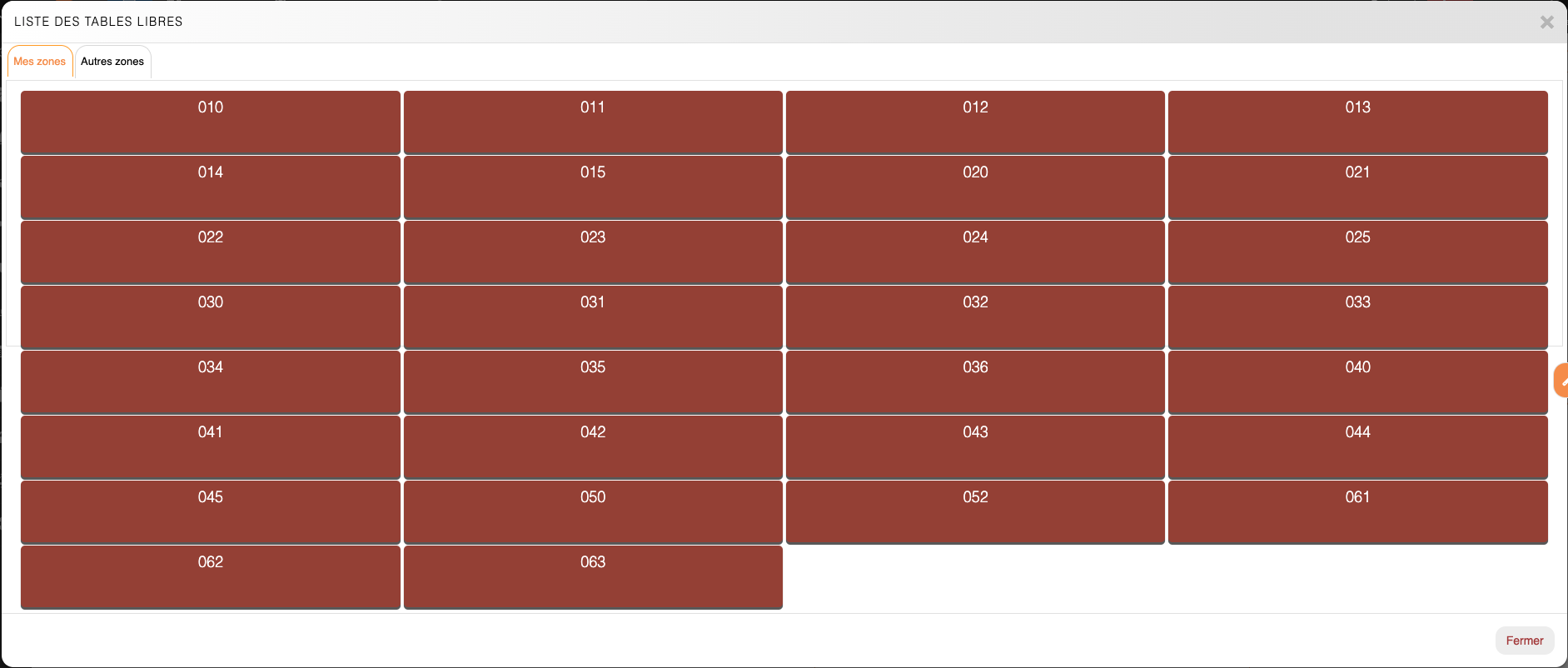 Liste des tables libres de ma zoneLa fenêtre de sélection des tables libres s'ouvre pour permettre au serveur de choisir la table en question en cliquant dessus.