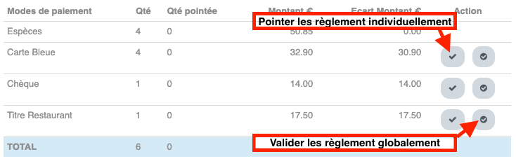 Pointer les règlementsLa partie encaissement permet de pointer les règlements individuellement ou de manière globale pour chaque mode de paiement.