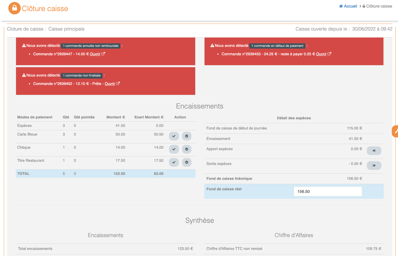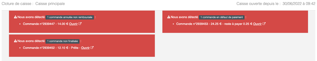 Sur l'interface de clôture de caisse, un récapitulatif vous alerte des commandes qui sont en défaut. Pour pouvoir clôturer votre caisse sans erreurs, il est nécessaire de résoudre ces commandes.