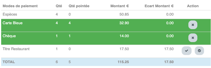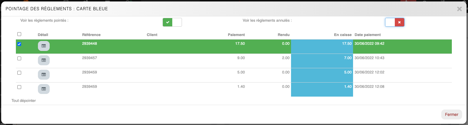 Règlements pointésLorsque tous les règlements ont étés pointés, la ligne du mode de paiement se met en vert. Il est possible de dépointer tous les règlements en cliquant sur la croix.