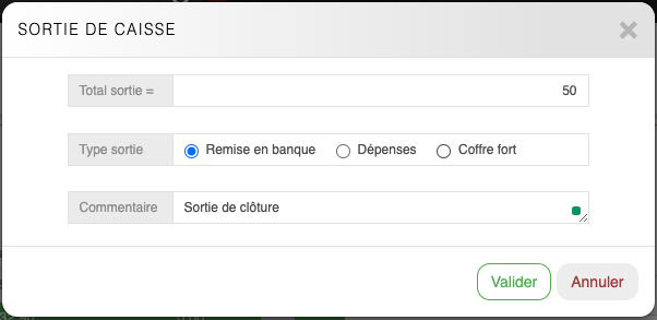 Sortie des EspècesLors de la clôture de caisse, il faut sortir l'espèce en trop de la caisse afin de remettre le fond de caisse en ordre, en indiquant le montant, le type ainsi que la raison de la sortie d'espèces.