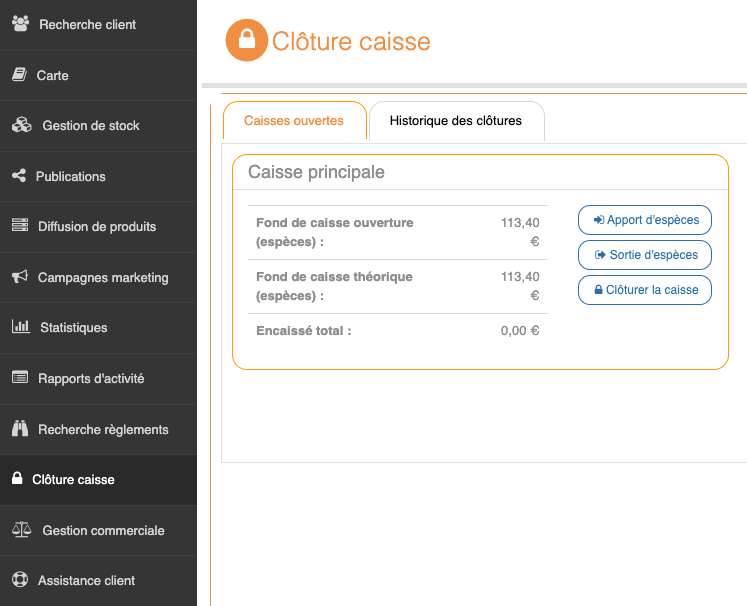 Page Clôture CaisseLa clôture de caisse se fait depuis la page « Clôture caisse » dans le menu latéral gauche en cliquant sur le bouton « Clôturer la caisse ».