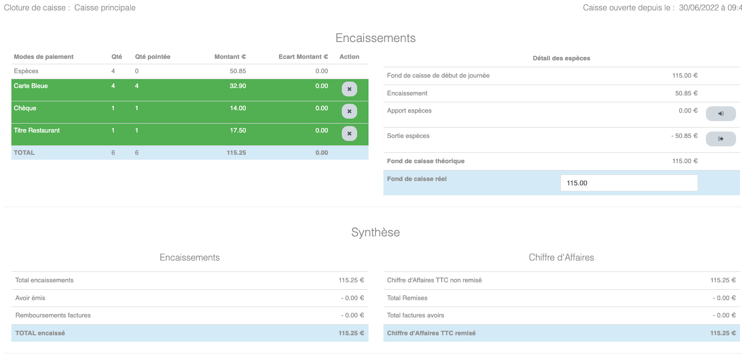 Clôture de caisse terminéeLorsque la clôture est terminée, il ne reste plus qu'à valider la clôture de caisse grâce au bouton Valider en bas de la page.
