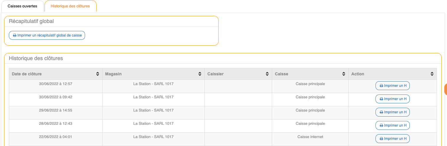 Historique des clôturesIl est possible de consulter les anciennes clôtures de caisse via l’onglet « Historique des clôtures » permettant ainsi d’avoir un suivi.
