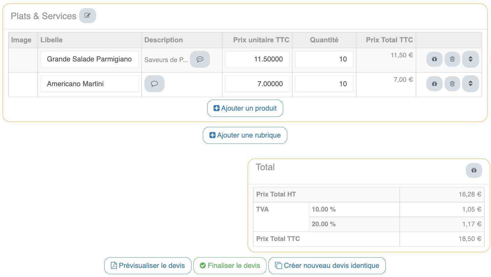 Produits ajoutés à la rubriqueIl est possible de modifier l'ordre des rubriques grâce aux flèches directionnelles afin de hiérarchiser et de structurer le devis.