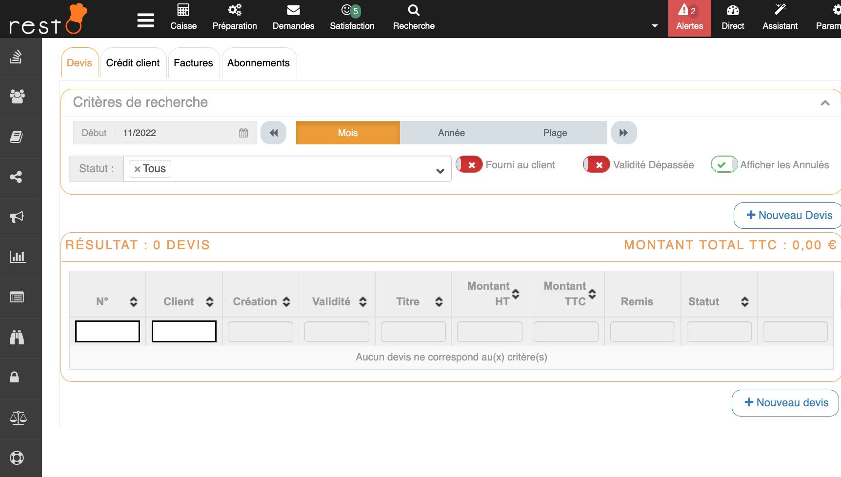 Un devis est un document qui permet de faire une proposition commerciale à une personne ou à une société. Avec la solution Restô, le restaurateur va pouvoir faire des devis à ses consommateurs.