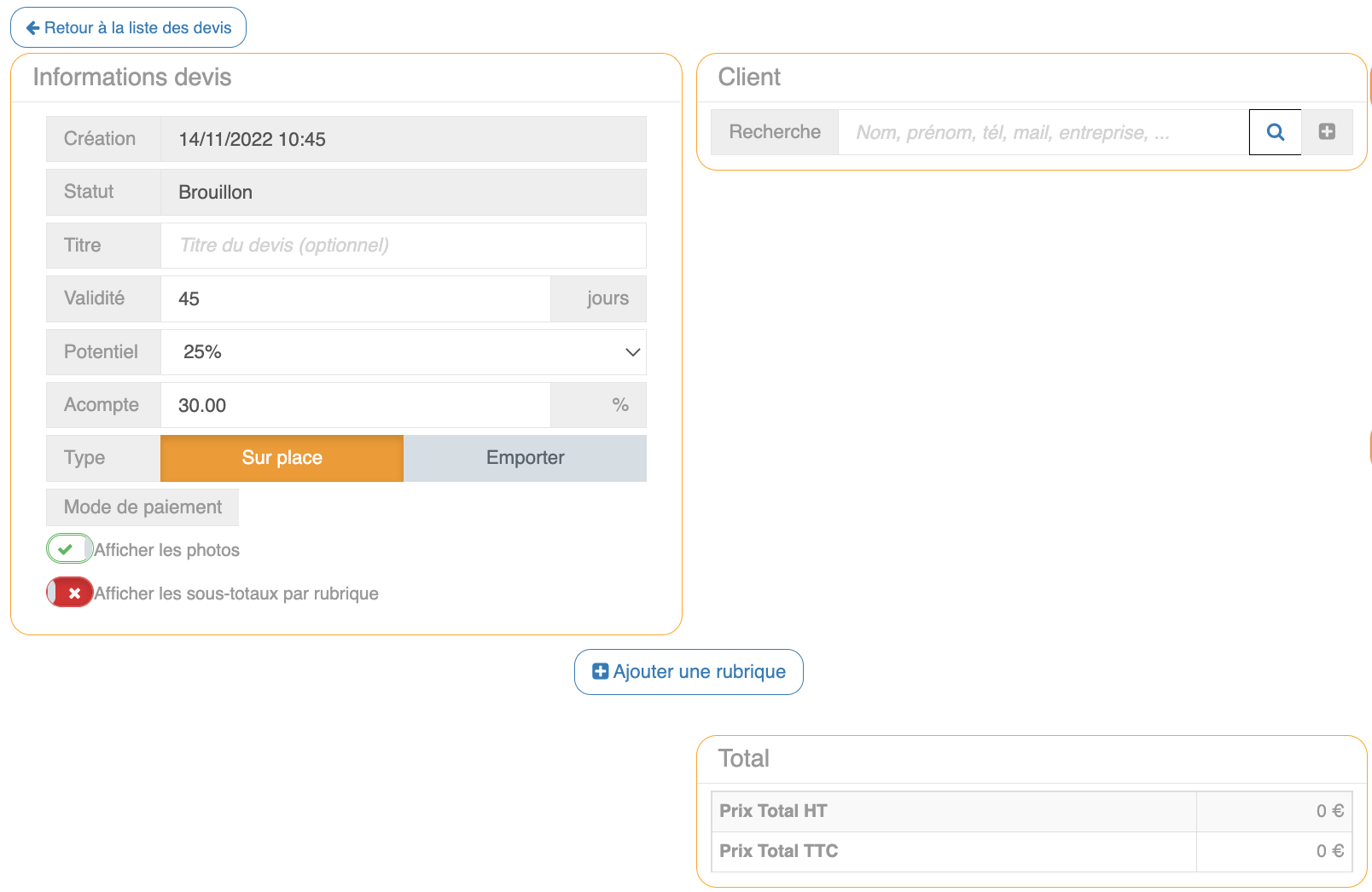 Le restaurateur doit associer le devis à un client, qu'il s'agisse d'un professionnel ou d'un particulier. Grâce au bloc « Client », il va pouvoir le rechercher dans la base client ou créer un nouveau client.