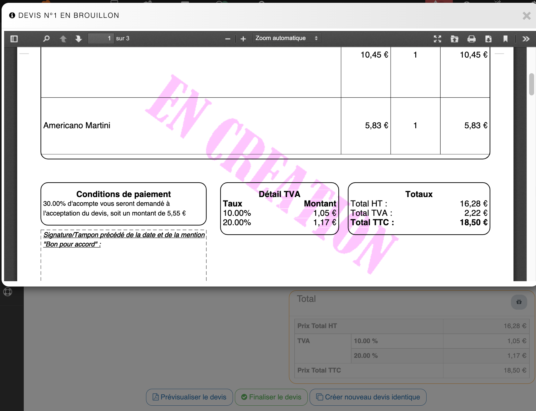 Visualisation du devisAprès avoir rempli le devis, il y a la possibilité de le visualiser avant de la finaliser. On peut également créer un devis à l’identique afin de le dupliquer pour un autre client pas exemple.