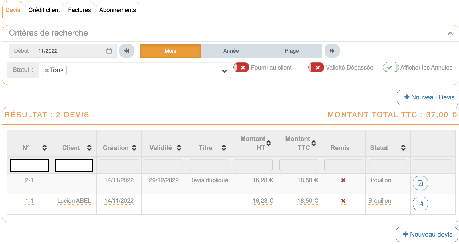 Interface Liste des devisLe devis apparaitra ensuite dans la liste des devis.