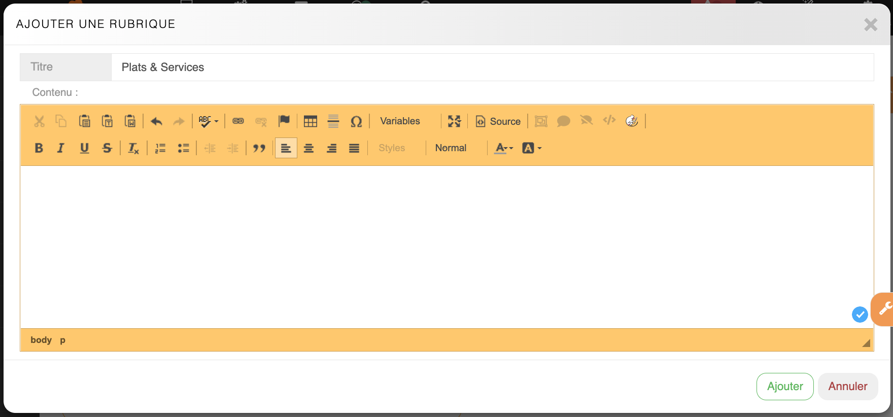 Ajouter une rubriqueAprès avoir cliqué sur « Ajouter une rubrique », l'interface de création s'ouvre. Celui-ci permet de donner un titre à la rubrique ainsi qu'une description de celle-ci éventuellement.