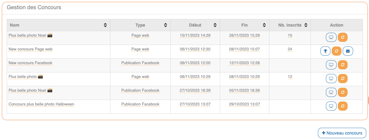 Pour ajouter un concours, il suffit de cliquer sur « + Nouveau concours » afin d'ouvrir l’interface de création d’un concours.