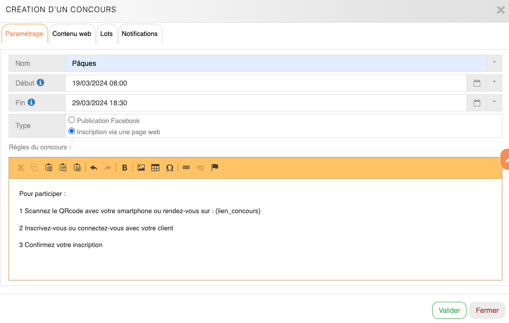 Création d'un jeu concours via une page web - Onglet Paramétrage