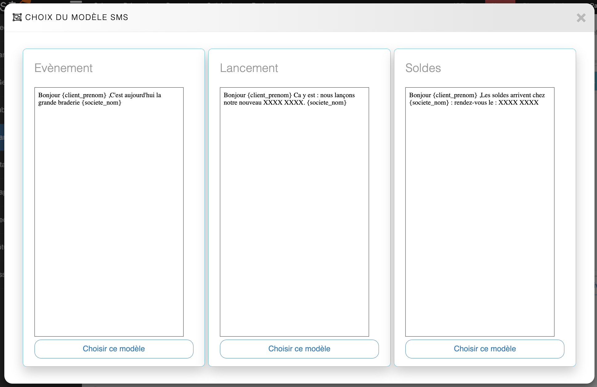 Choix du modèle SMSPour une campagne SMS, il va avoir le choix entre 3 modèles SMS.