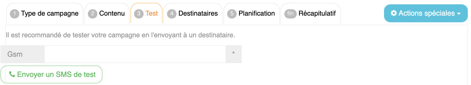 Test Campagne SMSLors d'une campagne SMS, il est possible de s'envoyer un SMS de test en indiquant son numéro.