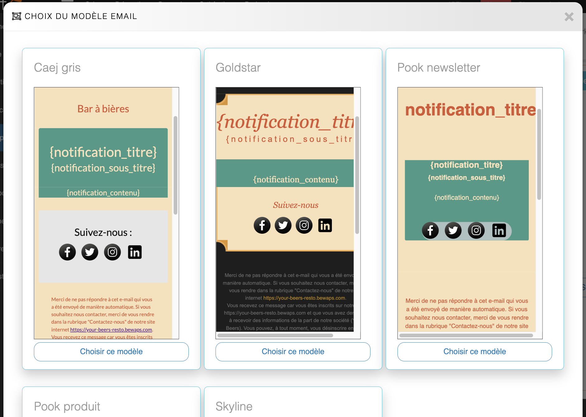 Choix du modèle emailPour une campagne e-mail, le restaurateur a le choix entre plusieurs modèles d'email.