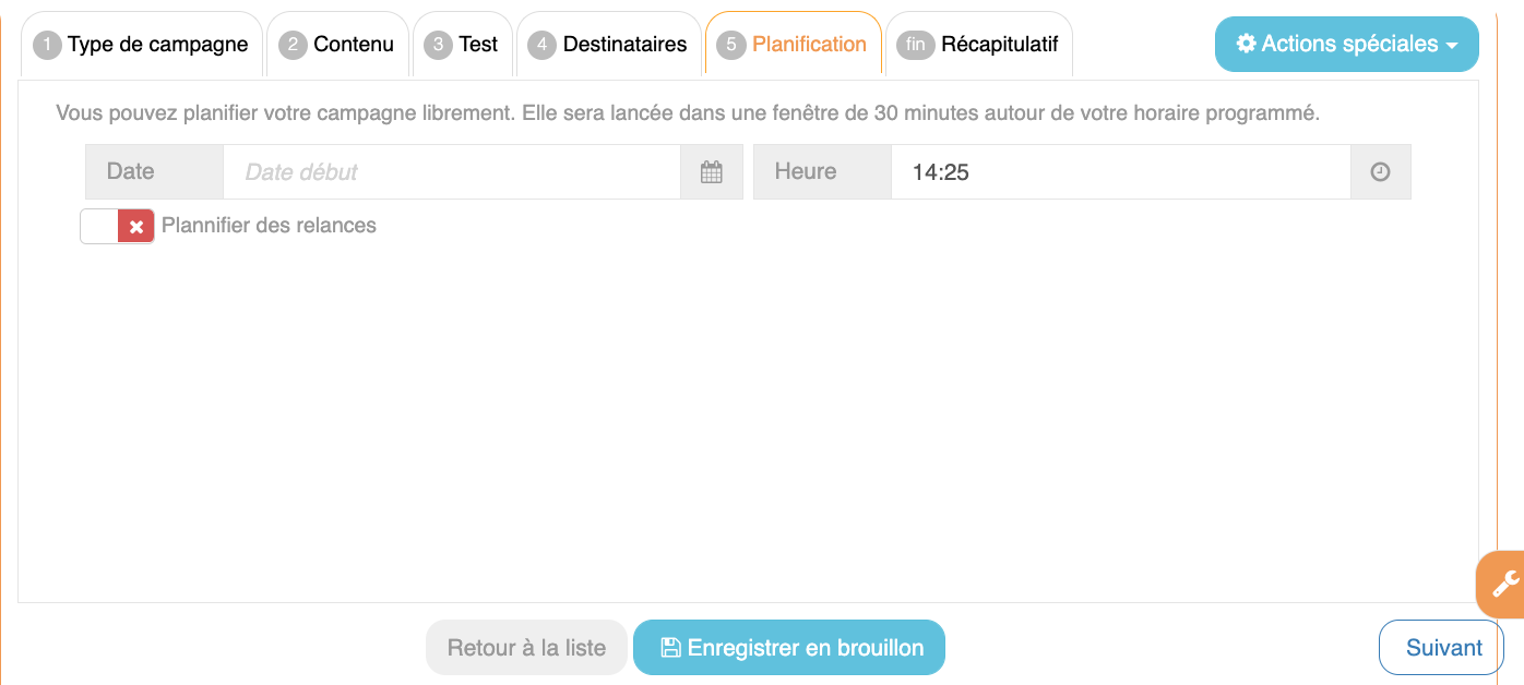 Planification Campagne EmailLa planification n’est pas obligatoire, le restaurateur peut envoyer directement la campagne.