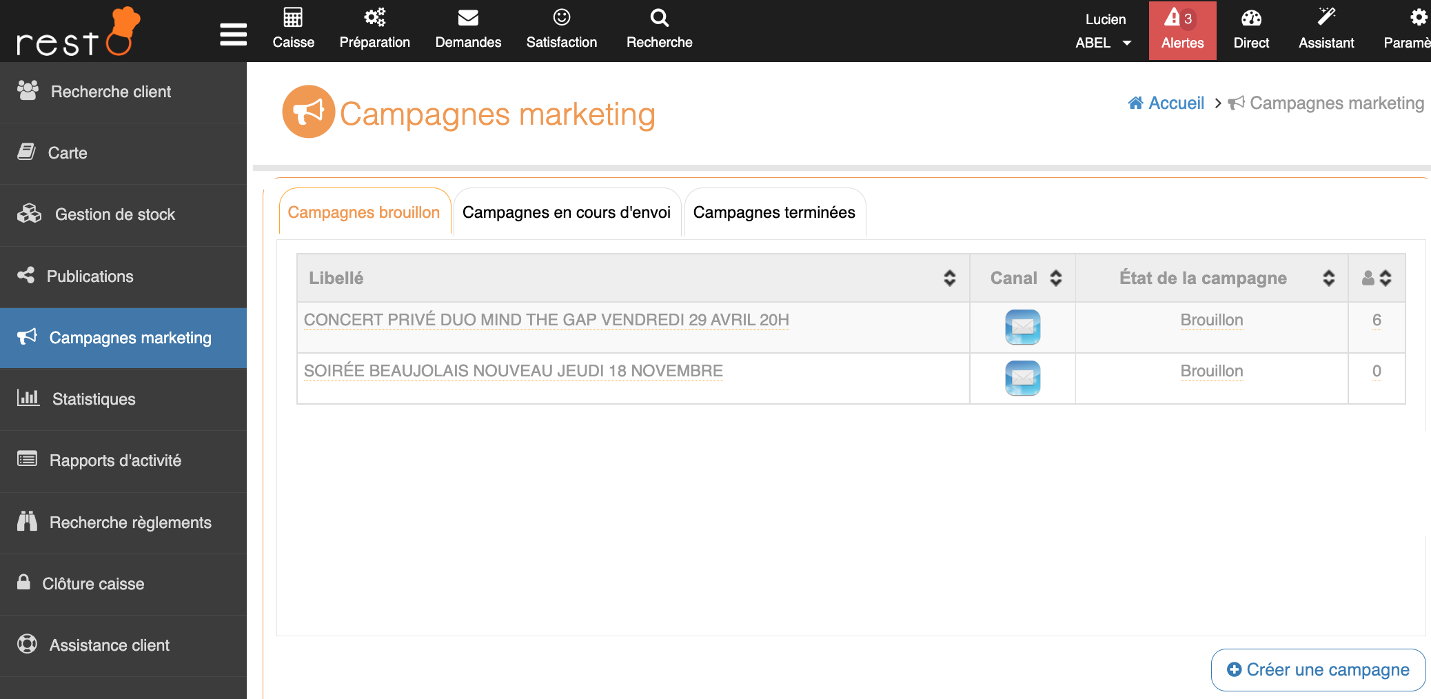 Interface Campagnes marketingDepuis l’interface des campagnes marketing, le restaurateur va retrouver toutes les campagnes qui sont en brouillon, en cours d’envoi ainsi que celles qui ont été envoyés.