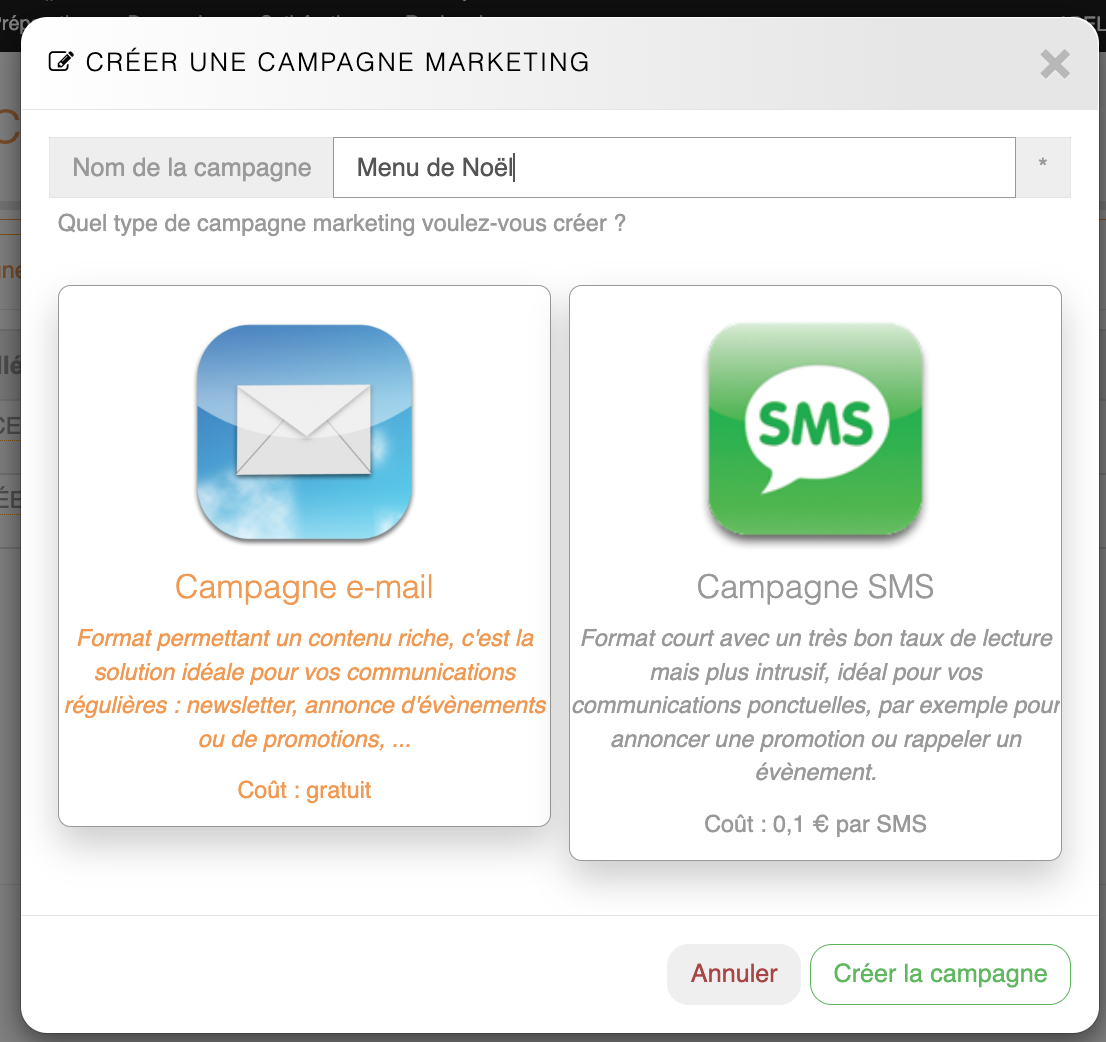 Les campagnes marketing permettent au restaurateur de communiquer avec ses clients par mail ou SMS pour leur présenter le menu de la semaine, annoncer un évènement ou une opération de promotion.