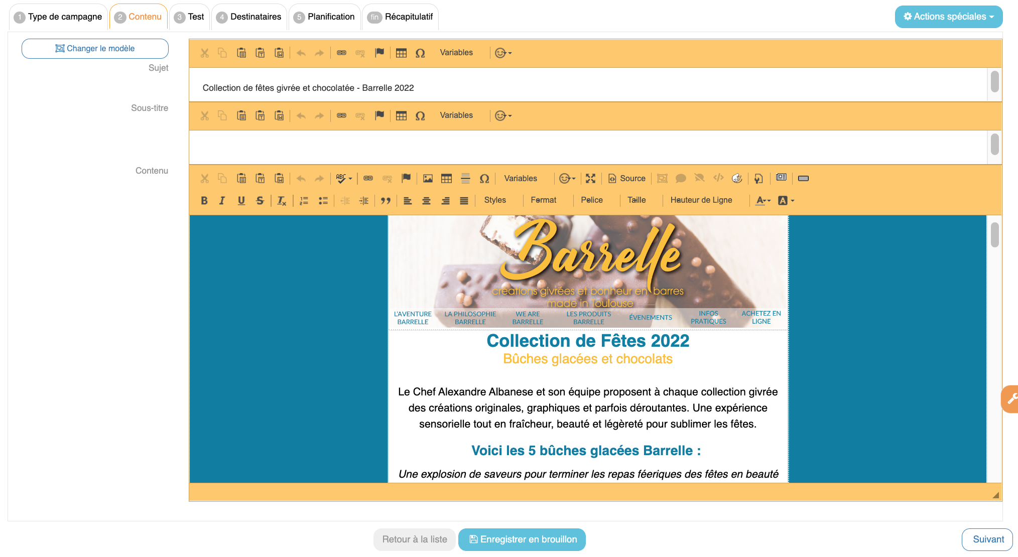 Une fois terminé, il est possible d’envoyer la campagne ou de l’enregistrer en brouillon pour la reprendre plus tard.