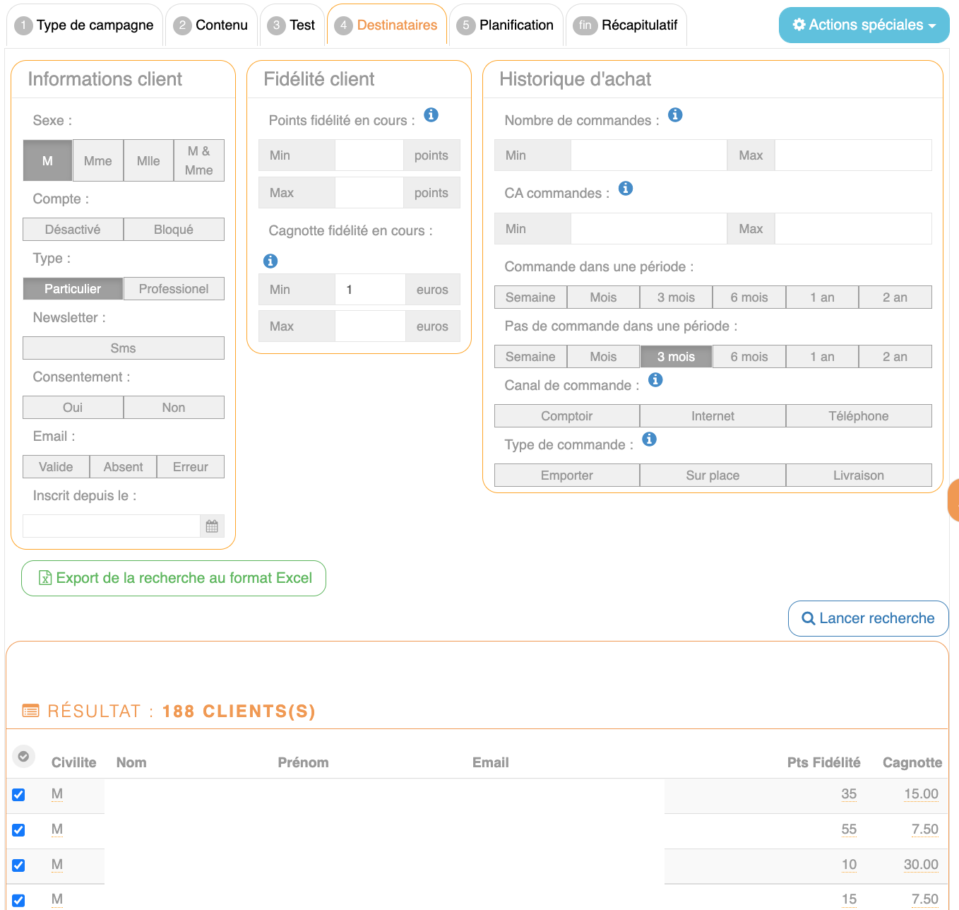 Après avoir testé sa campagne marketing, le restaurateur va pouvoir sélectionner les clients à qui envoyer la campagne.
