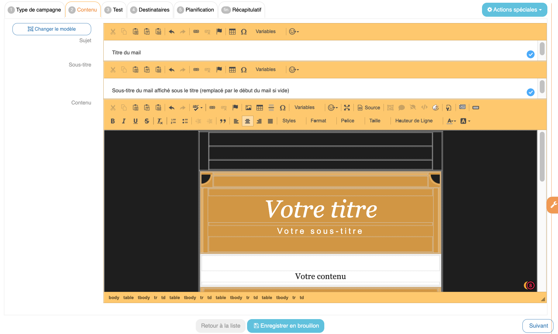 Personnalisation Campagne EmailUne fois le modèle choisi, il peut personnaliser le contenu et le style du mail.