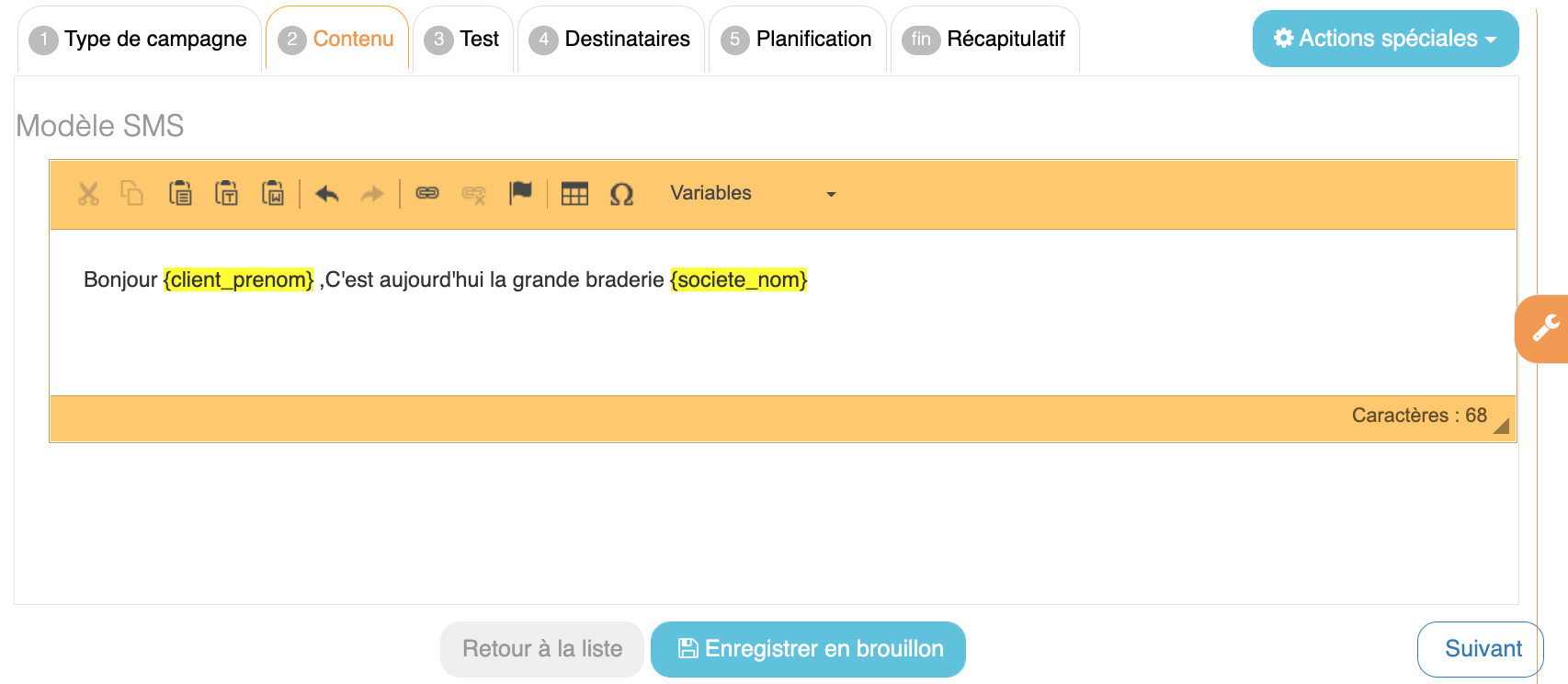 Personnalisation Campagne SMSL'onglet Contenu permet au restaurant de personnaliser de contenu de la campagne SMS avant de passer à l'étape « Test ».