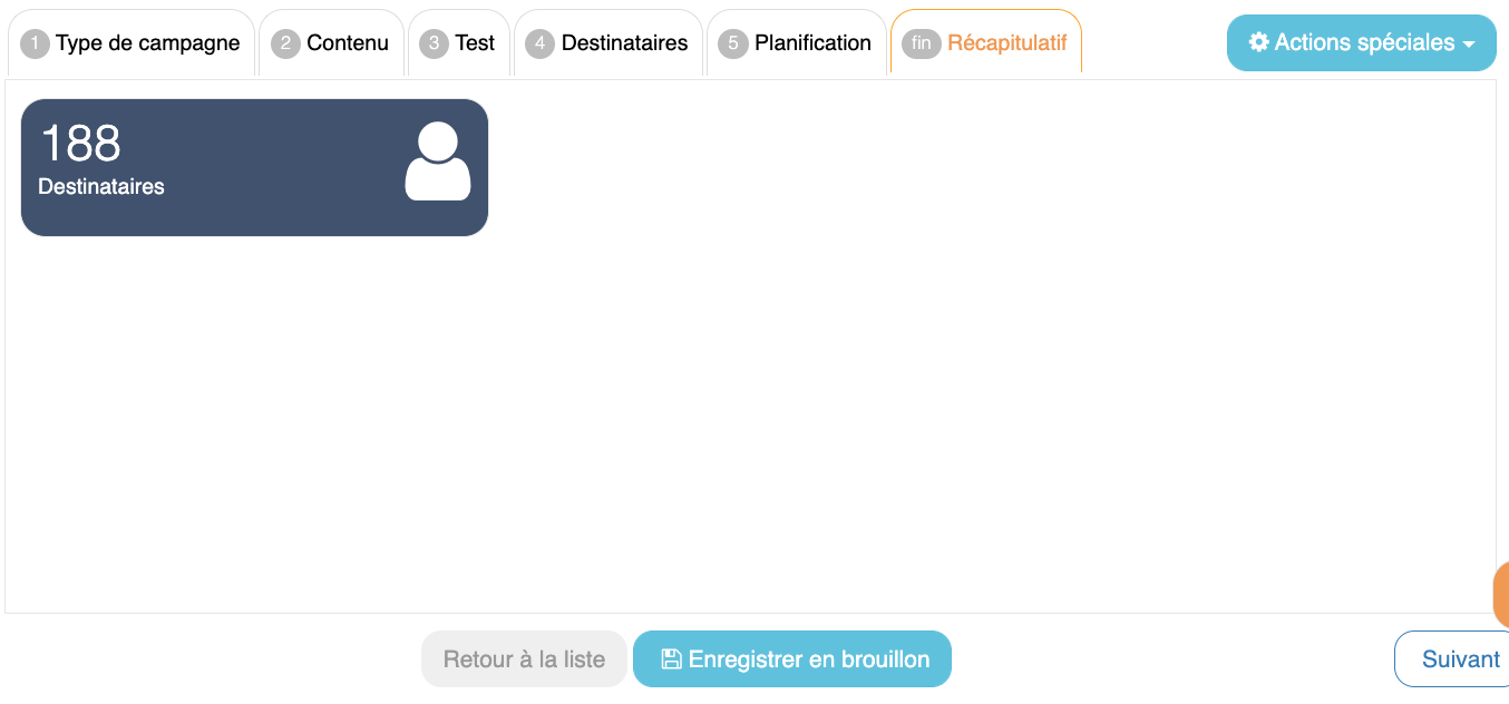 Récapitulatif Campagne marketingL'étape « Récapitulatif » montre le nombre de destinataires de la campagne.