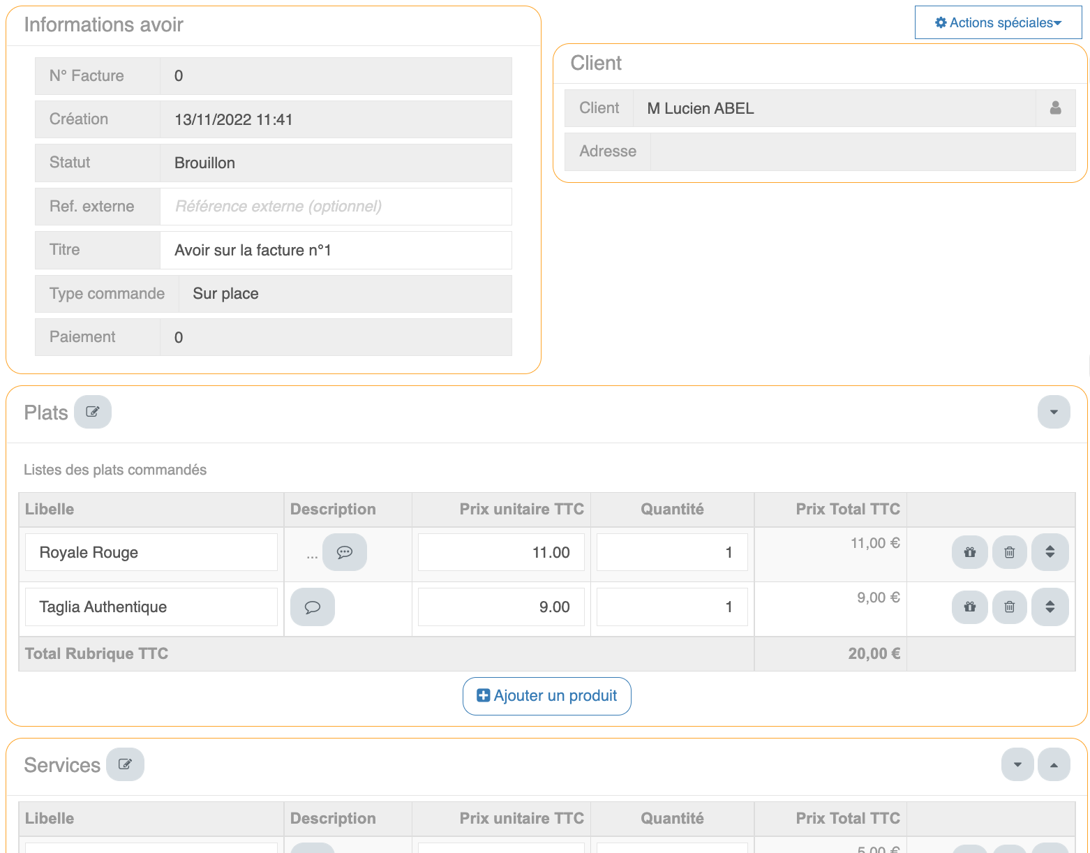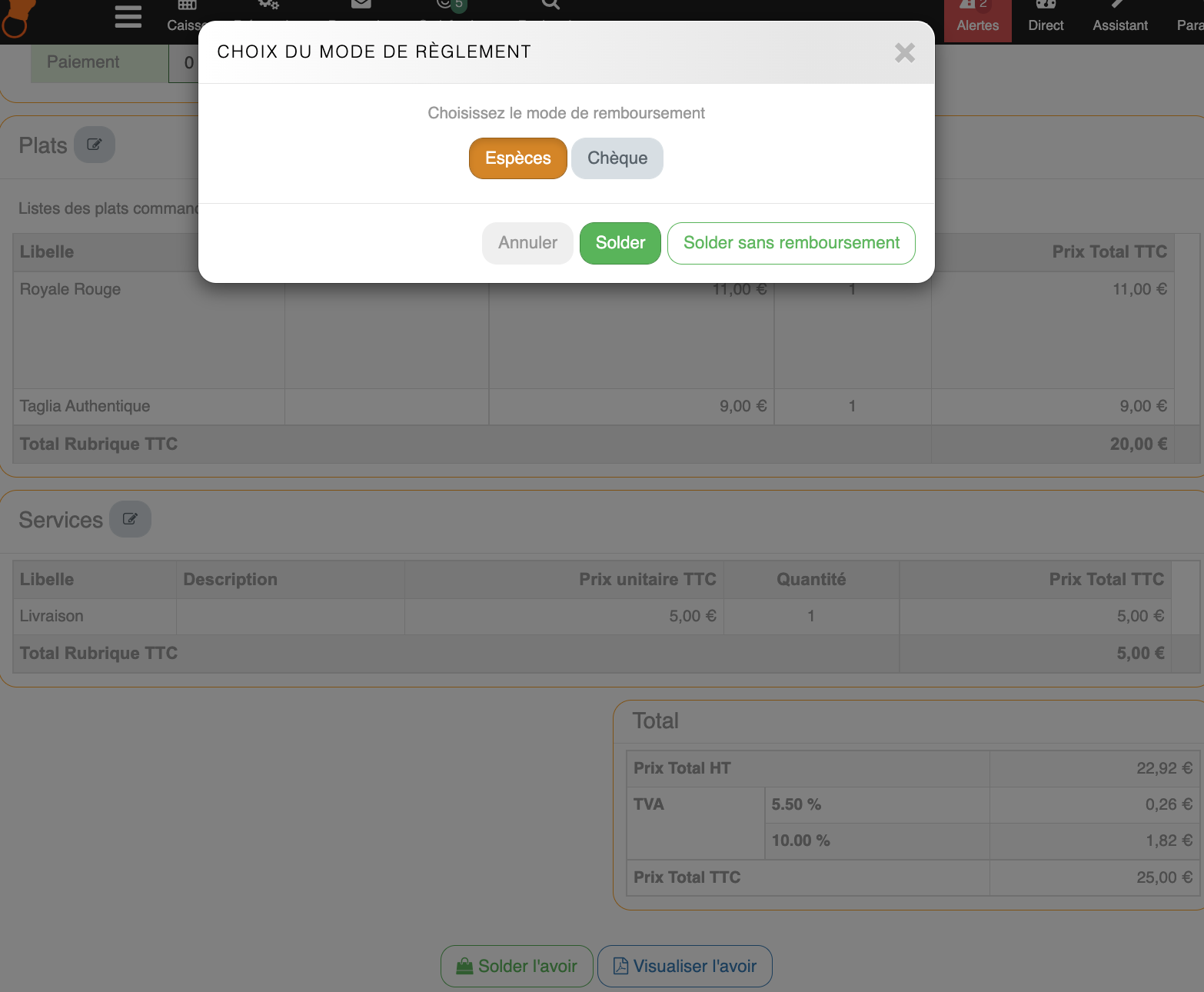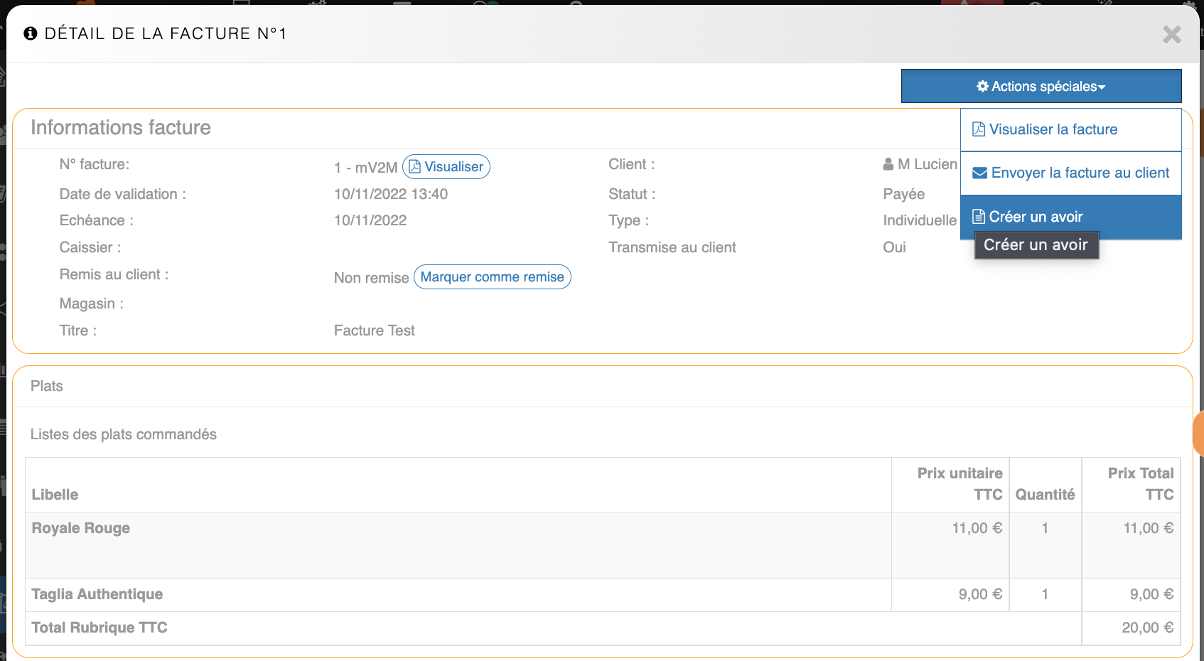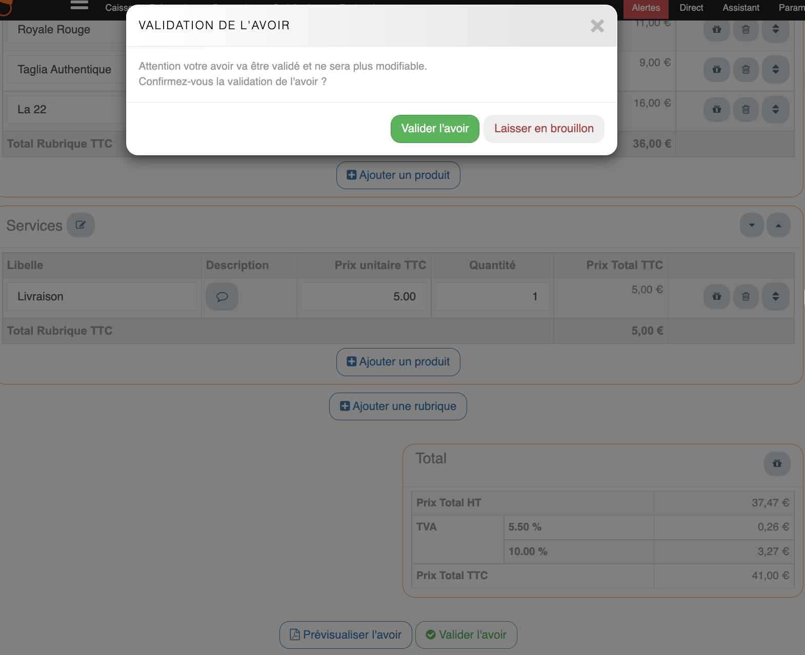 Validation de l'avoirUne fois les modifications terminées, le restaurateur peut « Valider l'avoir ».